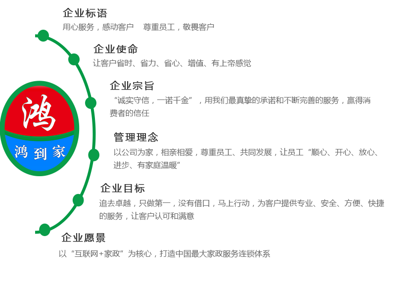 鴻到家家政所有服務(wù)人員都是企業(yè)員工,更好的把企業(yè)標(biāo)準(zhǔn)規(guī)范執(zhí)行下去,在服務(wù)過程中及服務(wù)過后有問題,客戶都可以找到我們解決。我們將秉承尊重員工、敬畏客戶的理念和不滿意、不收費的服務(wù)承諾為客戶提供方便、快捷、優(yōu)質(zhì)、安全的服務(wù)。鴻到家家政——百萬家庭共同的選擇!